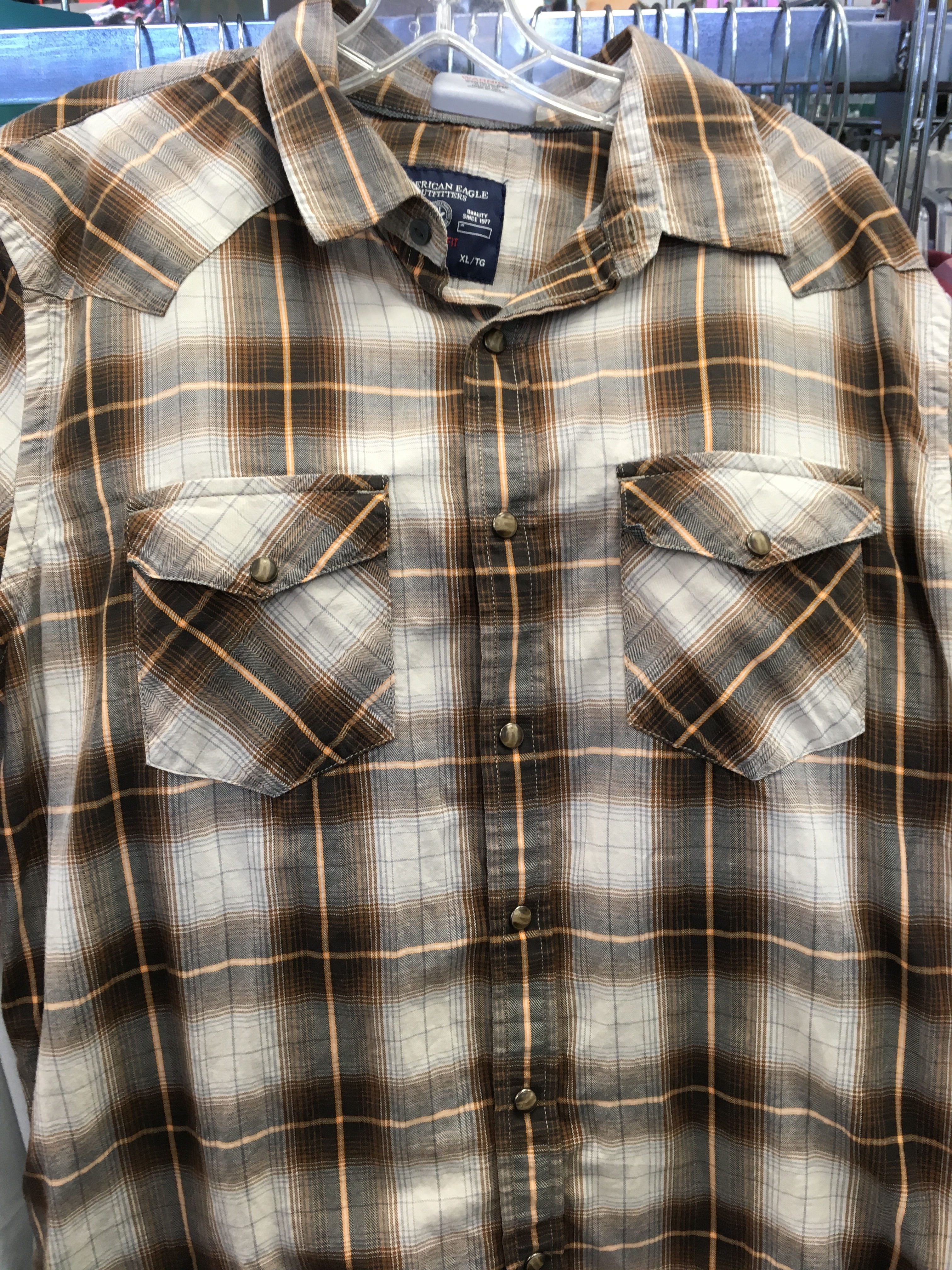 American Eagle Outfitters western snap button shirt Posted by snapbuttonshirtguy on March 25, 2018March 25, 2018 Found this American Eagle Outfitters western snap button shirt at a Plato’s Closet.